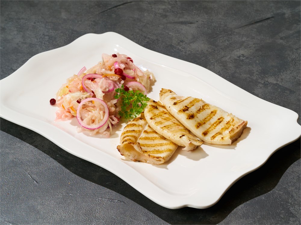 филе кальмара, обжаренное на гриле с домашней квашенной капустой с клюквой, заправленной нерафинированным растительным маслом